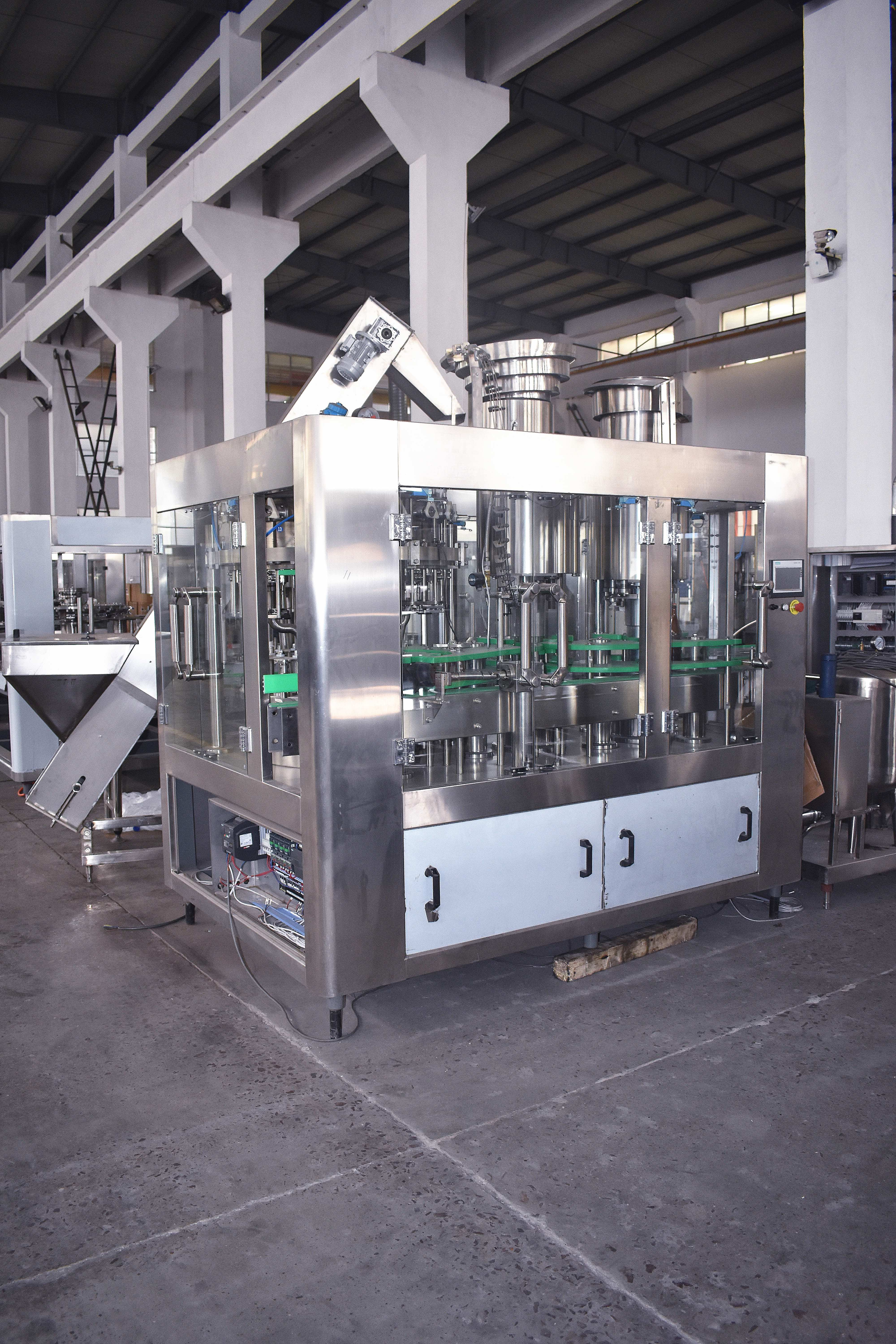 4. With a user-friendly human-machine interface, PLC control, and variable frequency speed regulation, the system includes functions such as automatic cap supply, filling temperature detection, high-temperature alerts, low-temperature shutdown, liquid recirculation, no bottle-no capping, and no cap-no operation.
